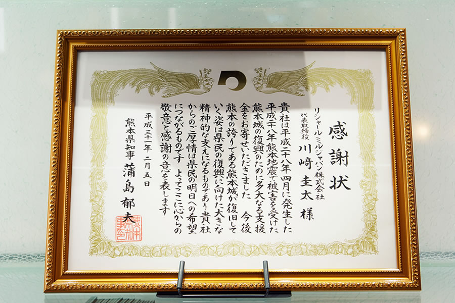 その一環として2016年から寄付しております平成28年熊本地震に係る文化財復興支援金に対し、蒲島郁夫熊本県知事と、くまモンが、感謝状贈呈にリシャール・ミル ブティック銀座店へ来店いたしました。