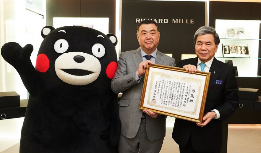 その一環として2016年から寄付しております平成28年熊本地震に係る文化財復興支援金に対し、蒲島郁夫熊本県知事と、くまモンが、感謝状贈呈にリシャール・ミル ブティック銀座店へ来店いたしました。
